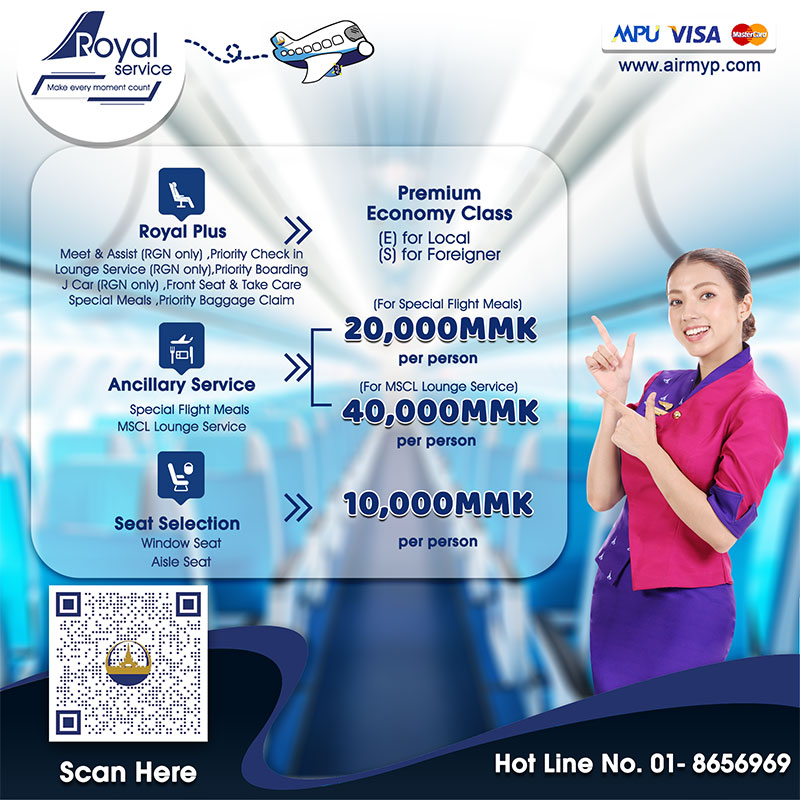 - Royal Service (Ancillary Service – Special Meals) အား လေယာဉ် မထွက်ခွာမီ ၂၄ နာရီ အကြိုတွင်သာ ဝယ်ယူရရှိနိုင်မည် ဖြစ်ပါသည်။